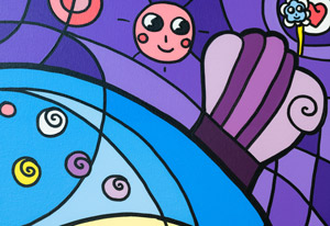 Tout comme l’oeuvre avec les bénévoles de la maison René-Verrier, ça ne s’est pas passé comme je l’avais imaginé. Ce n’était pas des gribouillis, comme avec les bénévoles, non, ici c’était des petites voitures, des fleurs, des soleils,etc. Je me suis demandé ce que j’avais pensé de vouloir vivre cette expérience, puisque mon style n’est pas figuratif à ce point…