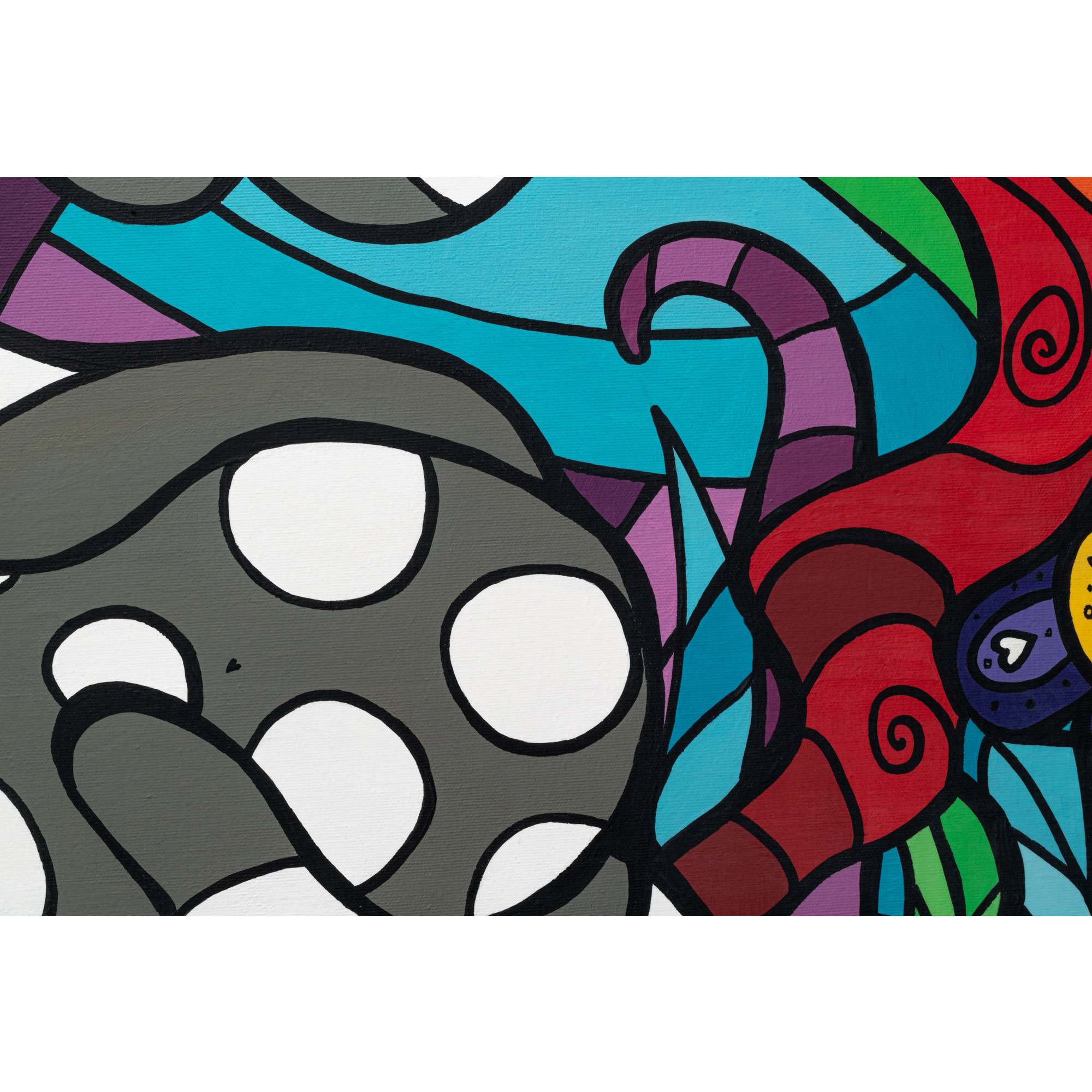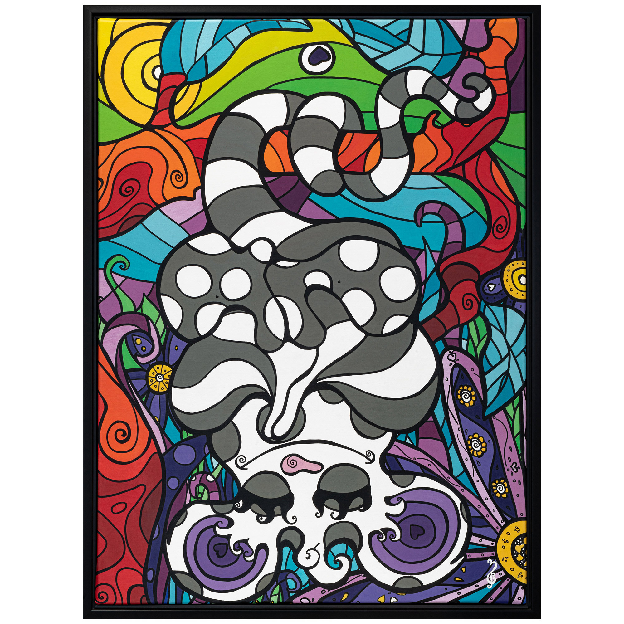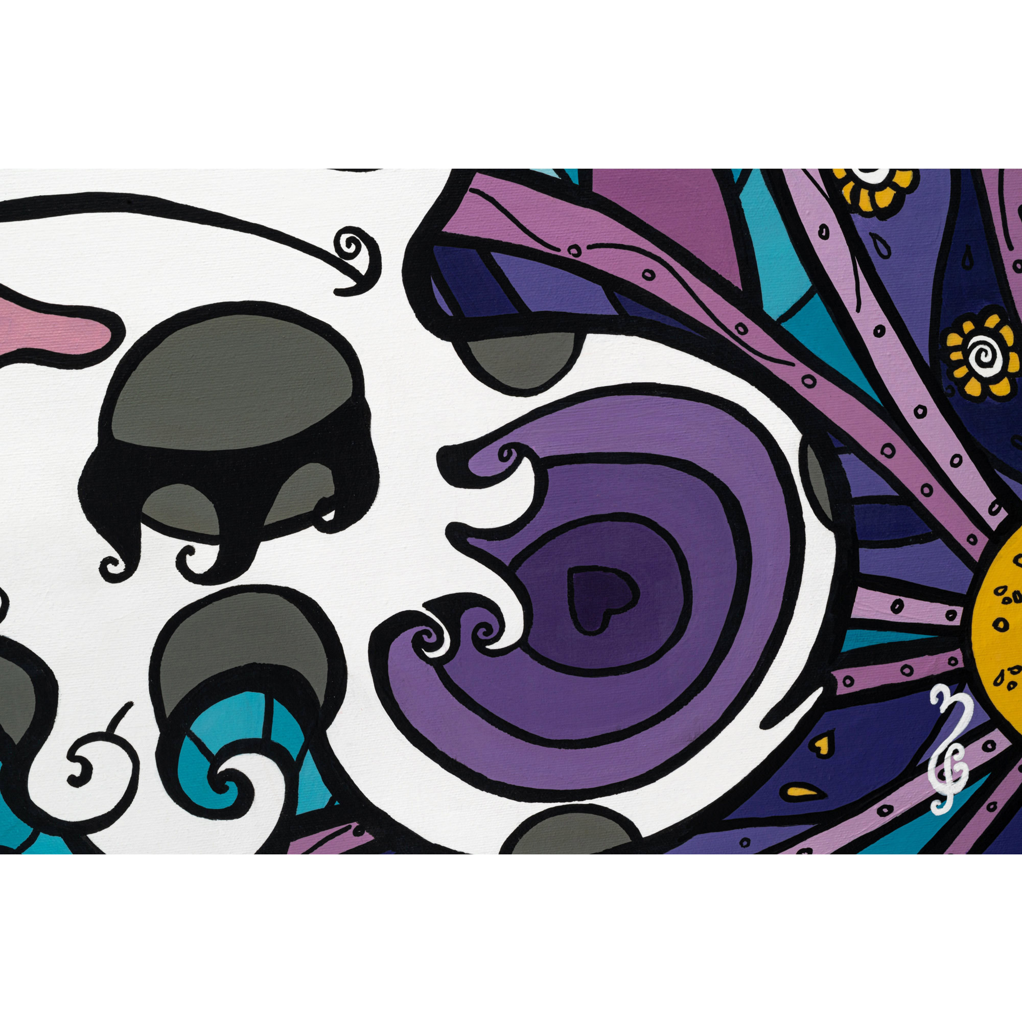 Suspendu, la tête en bas, à une branche d’arbre d’un bel orange-rouge qui rappelle la couleur rouge du chakra de la base. En position de méditation, main et pieds formant le mudra Atmanjali, les yeux fermés, l’opossum descend vers les couleurs bleu-violet des chakras supérieurs. Cette toile nous transporte droit à travers nos 7 centres énergétiques. Par ses symboles qui forment une étoile à 6 branches; composée des trois fleurs jaune et mauve et des oreilles et du cœur au-dessus de la branche, elle nous mène droit vers la Source, l’Unité de toute vie, la Conscience Suprême.
