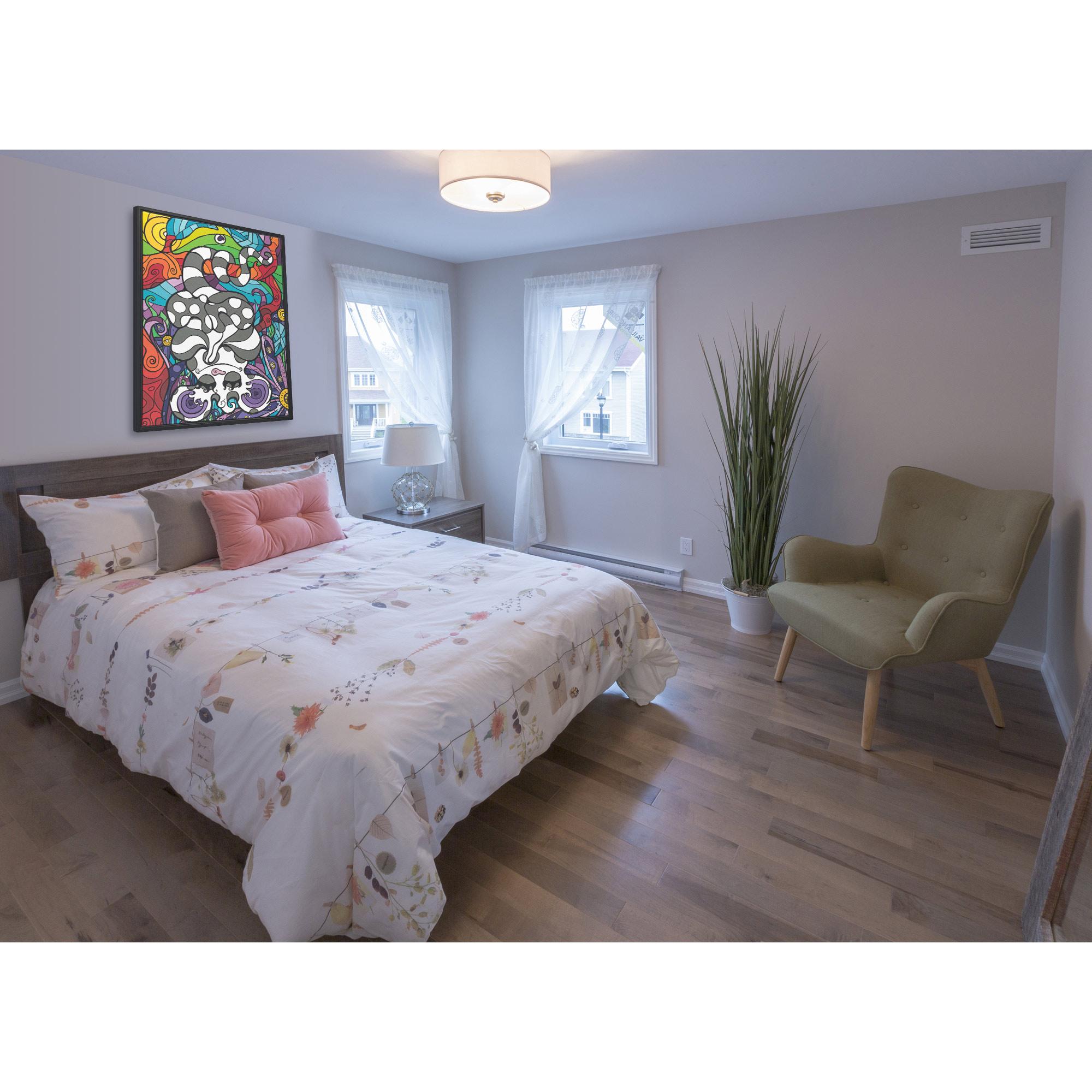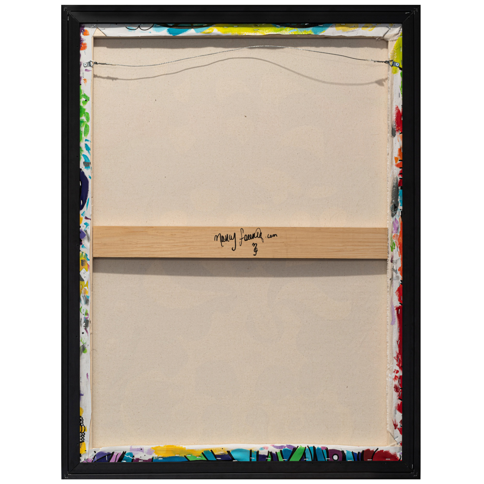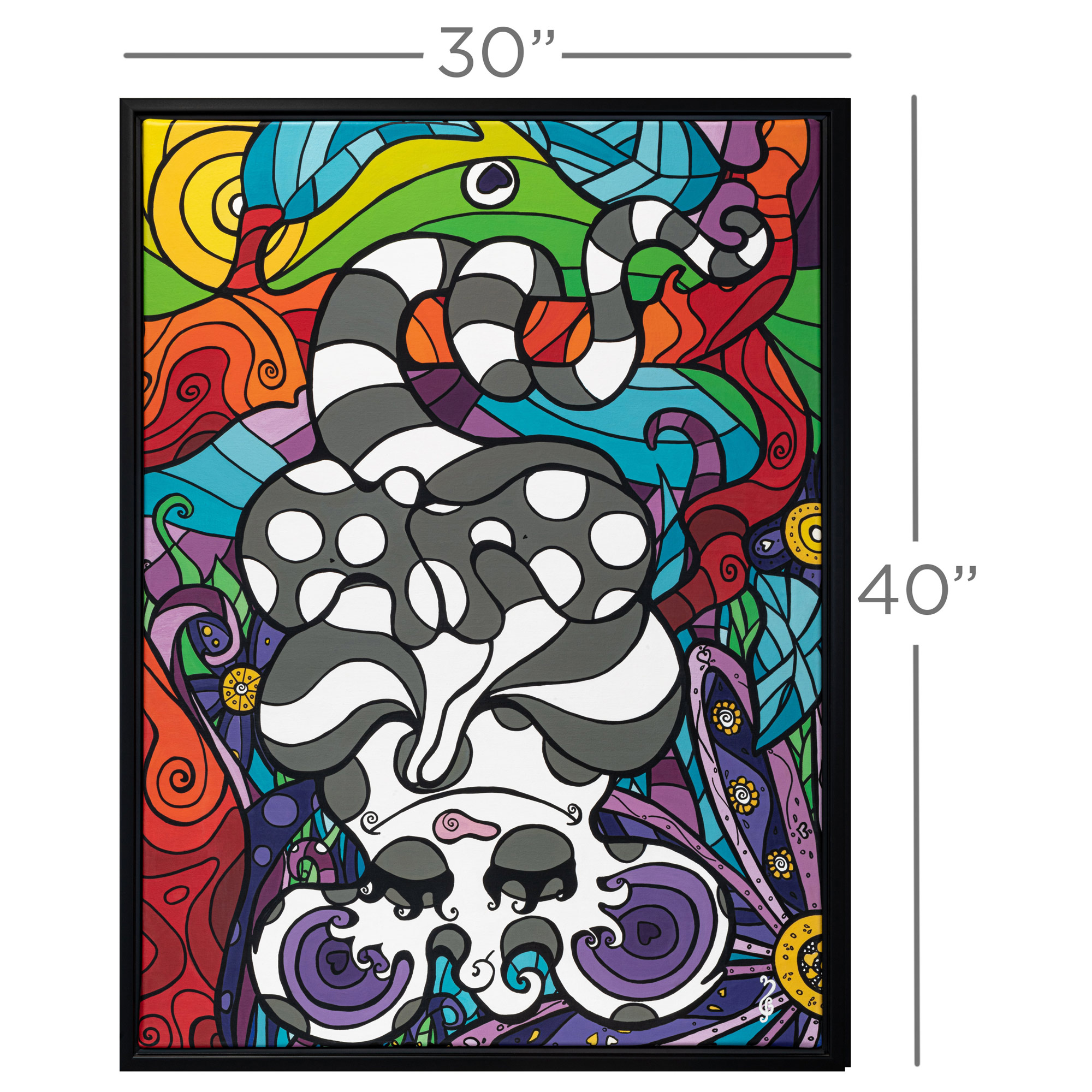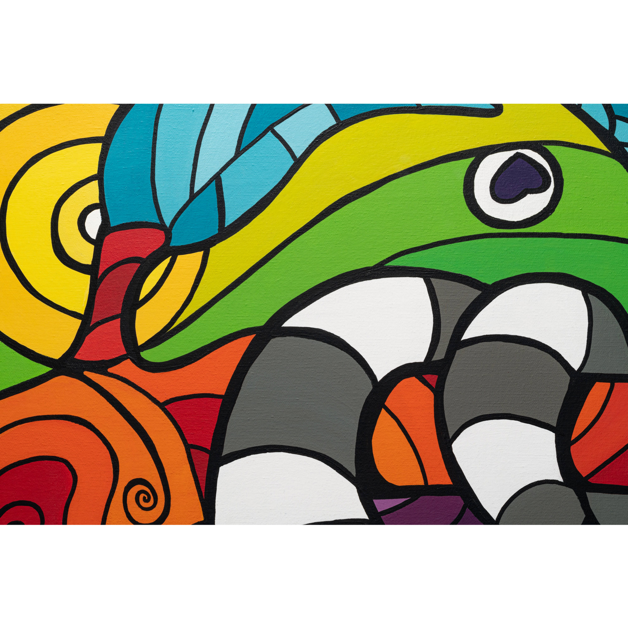 Suspendu, la tête en bas, à une branche d’arbre d’un bel orange-rouge qui rappelle la couleur rouge du chakra de la base. En position de méditation, main et pieds formant le mudra Atmanjali, les yeux fermés, l’opossum descend vers les couleurs bleu-violet des chakras supérieurs. Cette toile nous transporte droit à travers nos 7 centres énergétiques. Par ses symboles qui forment une étoile à 6 branches; composée des trois fleurs jaune et mauve et des oreilles et du cœur au-dessus de la branche, elle nous mène droit vers la Source, l’Unité de toute vie, la Conscience Suprême.