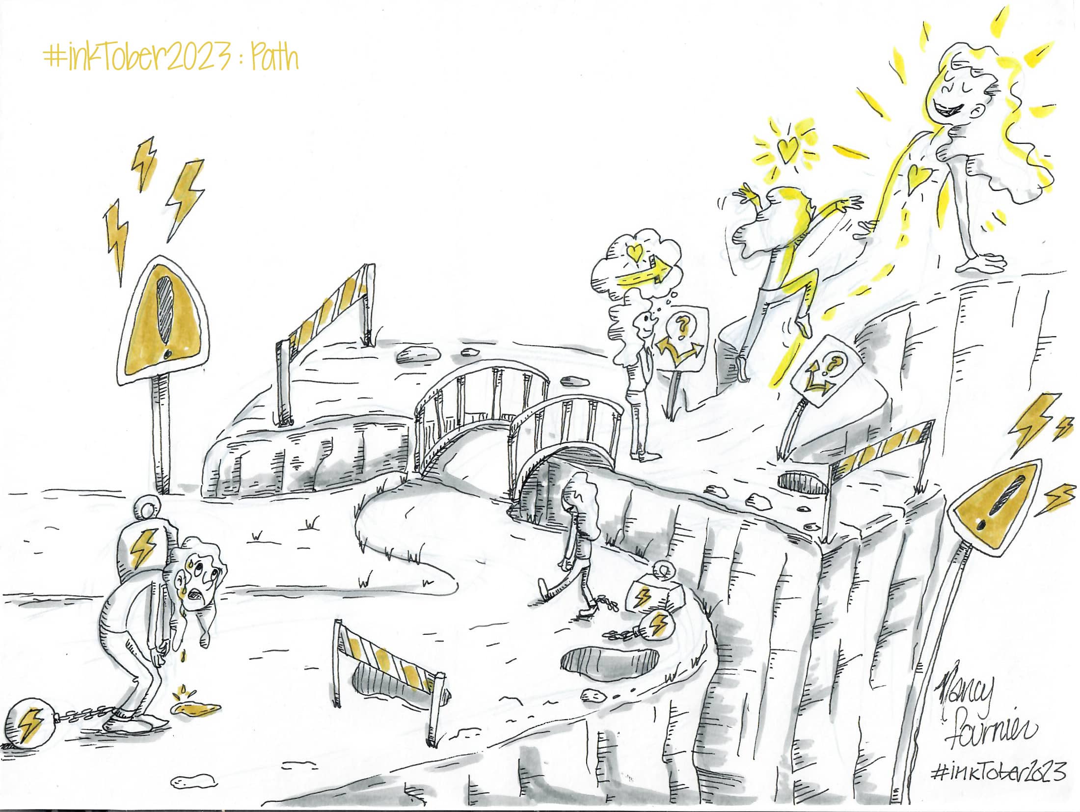 3 octobre 2023Uncategorized By nfournier J’ai décidé de faire le InkTober 2023, je le fais pour moi et prendre le temps de dessiner, mon monde intérieur et d’enfin le voir dans la matière. Jour 3 - Chemin J’ai fait cette image pour me rappeler que le chemin, c’est moi, à travers les choix que je fais à chaque instant, je deviens qui je suis aujourd’hui. Tout est toujours une question de CHOIX, aligné ou pas avec le cœur.